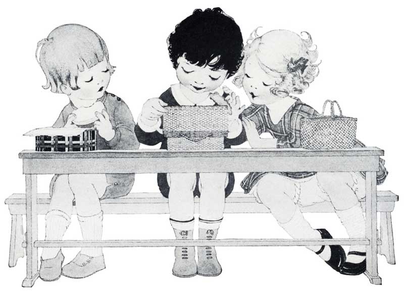 2014FallLunchbox3ChildrenOften the tin boxes are arranged with compartments and equipped with thermos bottles, and some are collapsible, so that they are easy to carry home. Baskets are not as easily cleaned as metal containers, and food carried in them has to be wrapped carefully so that it will not dry out. Fibre boxes are not expensive, but they take up moisture readily and are hard to keep clean.